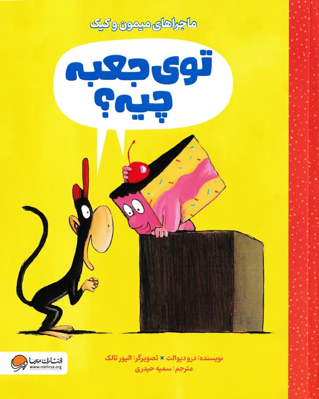 در کتاب «توی جعبه چیه؟» میمون جعبهای در دست دارد و ادعا میکند که داخل آن یک گربه است. کیک شک میکند و میگوید شاید چیز دیگری داخل آن باشد، حتی یک دایناسور! آنها بحث میکنند که چگونه میتوان فهمید حقیقت چیست. آیا باید در جعبه را باز کنند؟ اگر باز کنند، آیا جادو از بین نمیرود؟ این داستان دربارهی واقعیت و باور است. بچهها میآموزند که دیدن همیشه شرط کافی برای باور نیست. و خیال میتواند بهاندازهی تجربهی عینی ارزشمند باشد و پرسشگری مهمتر از رسیدن به پاسخ قطعی است. دیوالت داستان را بهگونهای تمام میکند که هیچ پاسخ نهایی داده نشود. تصویر پایانی، که گربهای روی دایناسور نشسته، نوعی بازی ذهنی است: شاید هر دو درست باشد، هم خیال میمون و هم خیال کیک و شاید هم هیچکدام!