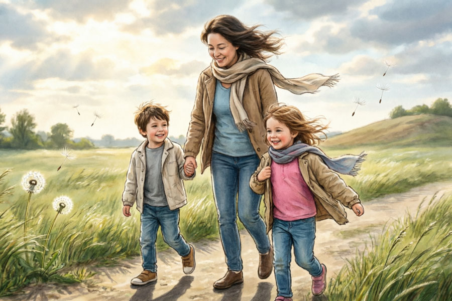 یک روز که باد میوزد، با کودک خود به بیرون از خانه بروید. لازم نیست پیادهروی طولانی بروید، همین که چند دقیقه در فضای باز بایستید یا قدم بزنید کافی است.