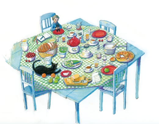 در تصویر ابتدایی یک میز بزرگ و سه صندلی، یک گربه خسته و خوابیده، یک دفتر که شاید دفتر خاطرات است و پسرکی کوچک و تنها دیده میشود. اما در تصویر آخر یک صندلی اضافه شده و میز پر از خوراکی و نوشیدنیهای رنگارنگ است. آرامش پسرک از صورت اش پیداست و گربه هم حتا بیدار است و هوشیار! ماریت تورن کویست به بهترین شکل این سفر درونی و تاثیرات خیال و رؤیا را بر کودکان با همین دو تصویر نشان داده است.